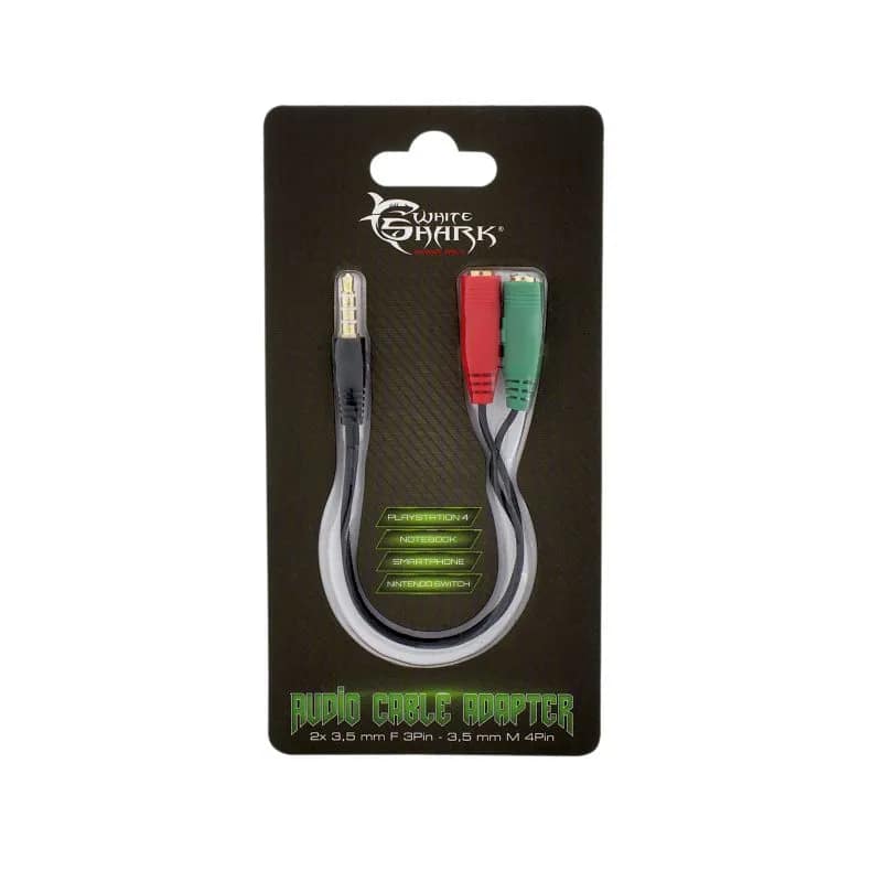 Dit is een kabel ontworpen door White Shark. Sluit een headset met afzonderlijke koptelefoon- en microfoonstekkers aan op de audiopoort van je Playstation 4, Smartphone, Notebook, Nintendo Switch en alle andere apparaten met een 4-pins audioaansluiting.