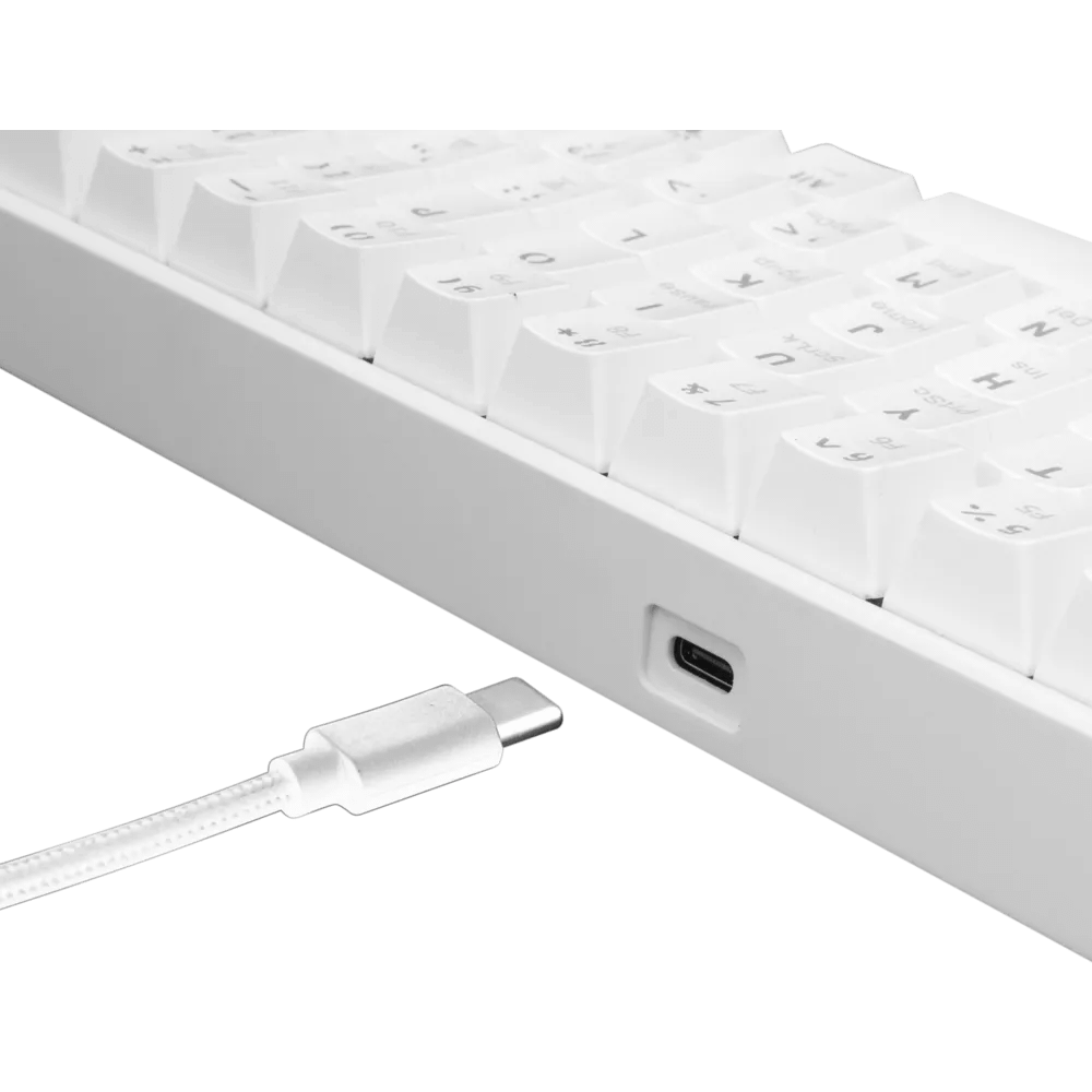 De stevige constructie bestaat uit een combinatie van kunststof aan de onderkant en metaal aan de bovenkant. Voorzien van de bekende blauwe Outemu switches, is dit toetsenbord zeer compleet en biedt een hele goede prijs/kwaliteit verhouding. De White Shark Shinobi wordt aangesloten via een USB naar USB C aansluiting van 1,5 meter lang. Deze kabel is ook los te koppelen.