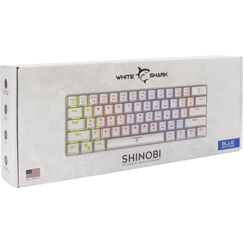 De White Shark Shinobi is een mechanisch toetsenbord voor de serieuze gamer en eSporter. Vanwege de TKL layout (TenKeyLess) waarbij het nummerieke gedeelte ontbreekt is dit toetsenbord een stuk compacter waardoor je deze gemakkelijk kunt meenemen en je meer bewegingsruimte hebt voor intensief gebruik van je muis. Daarnaast is dit toetsenbord 40% kleiner dan een volledig Gaming keyboard.